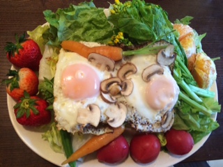 アサハ、ニンジント、イチゴト、マッシュルームメダマヤキ。